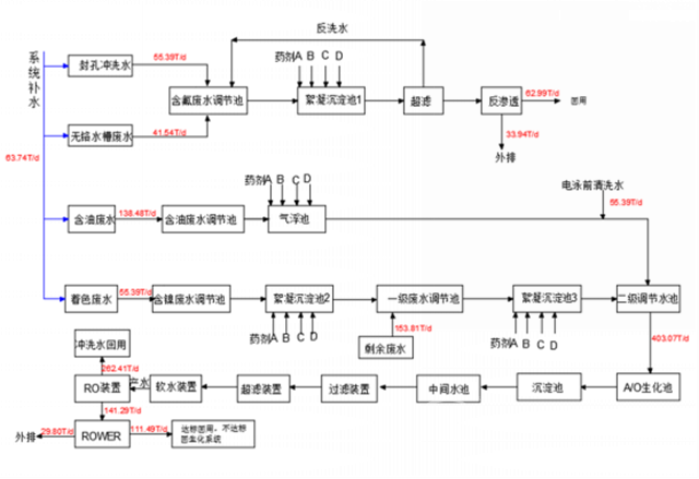 該工程設(shè)計按照氧化線處理水量10000噸/月,立式噴涂線處理水量3000噸/月,按每月30天,24小時連續(xù)運(yùn)行設(shè)計整個系統(tǒng)。經(jīng)過生化系統(tǒng)處理的水,進(jìn)回用水系統(tǒng),產(chǎn)生的濃水符合排放標(biāo)準(zhǔn)排入市政管網(wǎng)。