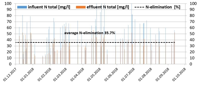除了上圖的意大利Alta Badia污水廠,AAA沉淀池在德國(guó)也有一個(gè)案例,人口當(dāng)量為46000PE,項(xiàng)目?jī)?nèi)容是對(duì)兩個(gè)現(xiàn)有初沉池進(jìn)行改造。該系統(tǒng)的COD去除率達(dá)66%,平均除磷率為43%,總氮去除率如下圖所示,平均為36%。