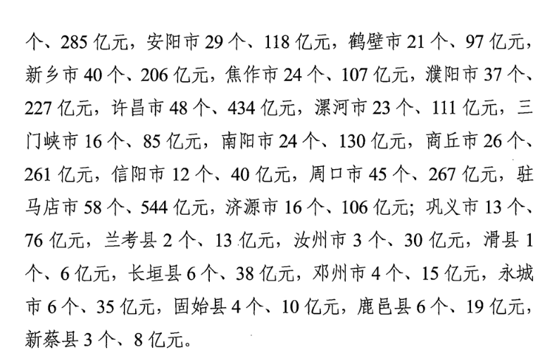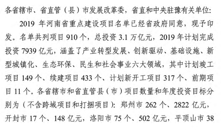 2月11日,河南省發(fā)改委發(fā)布《關(guān)于印發(fā)2019年河南省重點(diǎn)建設(shè)項目名單的通知》。名單共列項目910個,總投資3.1萬億元,2019年計劃完成投資7939億元,涵蓋了產(chǎn)業(yè)轉(zhuǎn)型發(fā)展、創(chuàng)新驅(qū)動、基礎(chǔ)設(shè)施、新型城鎮(zhèn)化、生態(tài)環(huán)保、民生和社會事業(yè)六大領(lǐng)域18個行業(yè)。其中計劃竣工項目149個、續(xù)建項目433個、計劃新開工項目317個、前期項目11個。