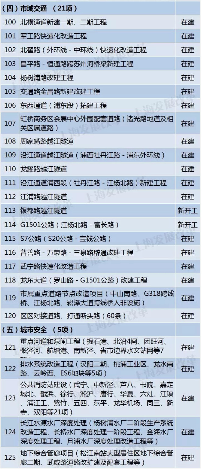 在建45項。包括:上海LNG儲罐擴建工程、浦東機場三期擴建工程、打通省界斷頭路、北橫通道、中心城區(qū)排水系統(tǒng)等。