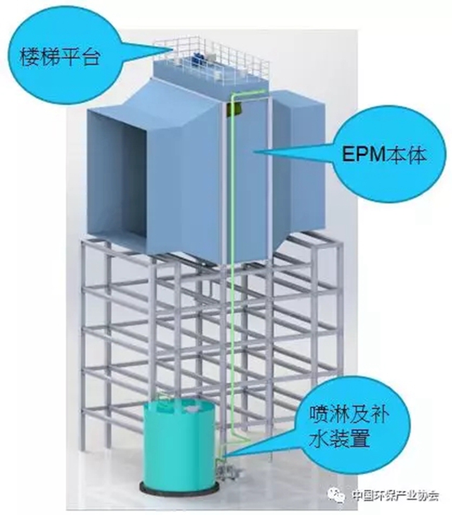 電風攔截系統(tǒng)主要由本體、噴淋系統(tǒng)及相應的樓梯平臺等組成,本體包括了氣流分布裝置、預荷電格柵、陰陽極、殼體、高壓電源及控制系統(tǒng)等。具體如下圖所示: