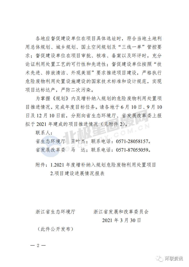 浙江省生態(tài)環(huán)境廳 浙江省發(fā)展和改革委員會(huì)關(guān)于發(fā)布2021年度增補(bǔ)納入規(guī)劃危險(xiǎn)廢物利用處置項(xiàng)目的通知各設(shè)區(qū)市生態(tài)環(huán)境局、發(fā)展改革委:為貫徹落實(shí)《中華人民共和國(guó)固體廢物污染環(huán)境防治法》,建設(shè)滿足當(dāng)?shù)匦枰睦锰幹迷O(shè)施,推動(dòng)形成“技術(shù)先進(jìn)、管理規(guī)范、能力富余、適度競(jìng)爭(zhēng)”的良性市場(chǎng)局面,根據(jù)各地上報(bào)項(xiàng)目,發(fā)布2021年度《浙江省危險(xiǎn)廢物利用處置設(shè)施建設(shè)規(guī)劃(2019-2022年)》(以下簡(jiǎn)稱(chēng)《規(guī)劃》)增補(bǔ)及調(diào)整的危險(xiǎn)廢物利用處置項(xiàng)目清單。