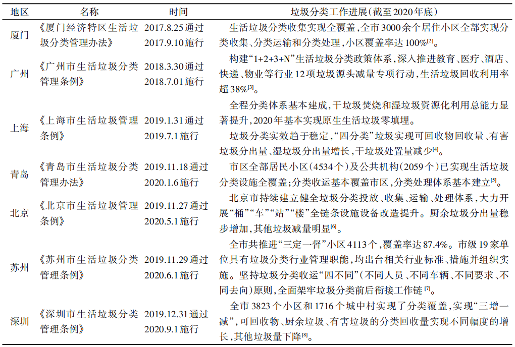 自2017年3月,國家發(fā)展改革委員會(huì)、住房城鄉(xiāng)建設(shè)部聯(lián)合發(fā)布了《生活垃圾分類制度實(shí)施方案》(以下簡稱《方案》[1])起,中國生活垃圾分類進(jìn)入“強(qiáng)制時(shí)代”,從過去的自愿參與,到法律法規(guī)條款下的強(qiáng)制執(zhí)行,垃圾分類已經(jīng)走過3個(gè)年頭。2020年4月29日第二次修訂通過的《中華人民共和國固體廢物污染環(huán)境防治法》提出設(shè)立生活垃圾分類制度,并堅(jiān)持政府推動(dòng)、全民參與、城鄉(xiāng)統(tǒng)籌、因地制宜、簡便易行的原則。《方案》中提出2020年底中國的省轄市、省會(huì)城市以及一些計(jì)劃單列市等46 座城市均要先行實(shí)施生活垃圾強(qiáng)制分類,從中央到地方,上海2019年帶頭實(shí)施,北京、廣州、浙江等省份2020年緊隨其后,過去1年垃圾分類行動(dòng)如火如荼向前推進(jìn)。表 1 整理了中國部分典型城市發(fā)布的垃圾分類相關(guān)政策方案,并對發(fā)布實(shí)施時(shí)間及工作進(jìn)展進(jìn)行梳理,其中廈門、廣州及上海分別代表了2017— 2019 年開展相關(guān)行動(dòng)的地區(qū),青島、北京、蘇州及深圳為2020年開始施行垃圾分類的重點(diǎn)城市,西安、成都、沈陽、濟(jì)南和石家莊將于 2021年正式實(shí)施。 住房和城鄉(xiāng)建設(shè)部于2020年12月召開新聞通氣會(huì)表示,中國當(dāng)前生活垃圾分類工作取得了階段性進(jìn)展,46個(gè)重點(diǎn)城市生活垃圾分類覆蓋7700 多萬家庭,居民小區(qū)覆蓋率 86.6%,其他地級城市生活垃圾分類已全面啟動(dòng)。