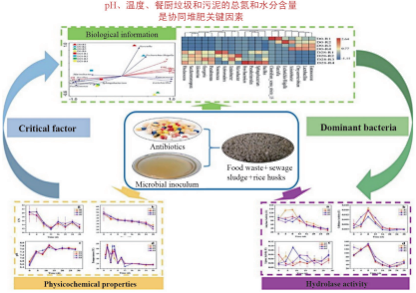 Chen等[39]將餐廚垃圾與污水污泥進(jìn)行協(xié)同好氧堆肥,研究了抗生素對水解酶活性和微生物群落的影響,發(fā)現(xiàn)5 mg/kg 的抗生素會(huì)降低纖維素酶的活性,增加脂肪酶和蛋白酶的活性,pH和溫度是影響微生物群落演替的最重要因素,其次是餐廚垃圾和污泥的共同堆肥過程中的總氮和水分含量(圖 4[39])。