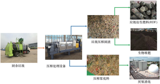 通過物理機(jī)械手段對廚余垃圾進(jìn)行預(yù)處理,有助于廚余垃圾更高效地實(shí)現(xiàn)減量化和資源化。目前國內(nèi)外研究和推廣較多的物理預(yù)處理技術(shù)主要包括粉碎直排和機(jī)械壓榨。廚余垃圾經(jīng)過物理手段預(yù)處理后的粒度變細(xì)可實(shí)現(xiàn)固體和漿體液的高效分離,可通過家庭下水排放進(jìn)入污水處理系統(tǒng),或通過制成垃圾衍生燃料、堆肥以及厭氧發(fā)酵等技術(shù)進(jìn)一步開發(fā)利用。