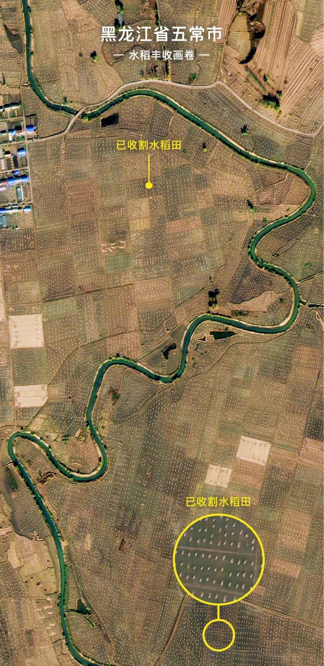 從衛(wèi)星視角俯瞰五常大地,隨處可見收割成捆的水稻立在稻田間,一捆一捆的“稻碼子”錯(cuò)落排列,滿目金黃,好似一個(gè)又一個(gè)的波點(diǎn),鑲嵌在阡陌交錯(cuò)田野畫布上。