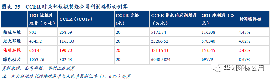 最理想情況下,CCER收入在利潤端可為垃圾焚燒頭部企業(yè)帶來3%-9%的增厚。我們選取瀚藍環(huán)境、光大環(huán)境、偉明環(huán)保和綠色動力四家頭部垃圾焚燒上市公司進行測算,在假設公司所處理的垃圾全部可以轉(zhuǎn)化為CCER的情況下,按照2021年的垃圾處理量和凈利潤,CCER收入可分別為瀚藍環(huán)境、光大環(huán)境、偉明環(huán)保、綠色動力帶來4.45%/4.02%/2.48%/8.67的利潤端彈性。