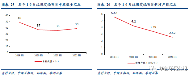 根據(jù)不完全統(tǒng)計,2022年1-6月全國垃圾焚燒發(fā)電項目開標數(shù)量為39個,投資總額約為145.09億人民幣,新增產(chǎn)能2.52萬噸/日,垃圾處理單價平均值為91.18元/噸。盡管中標項目數(shù)量較去年同期有所提升,但訂單的釋放省份多數(shù)位于中部地區(qū),日處理量超過1000噸僅6個(2021年同期為13個),故新增產(chǎn)能和投資額同比分別下滑25.66%和13.96%至2.52萬噸與145.09億元。但后補貼時代,新中標的垃圾焚燒發(fā)電項目噸垃圾處置費上浮明顯,較2021H1平均值84.04元/噸增長8.5%至91.18元。