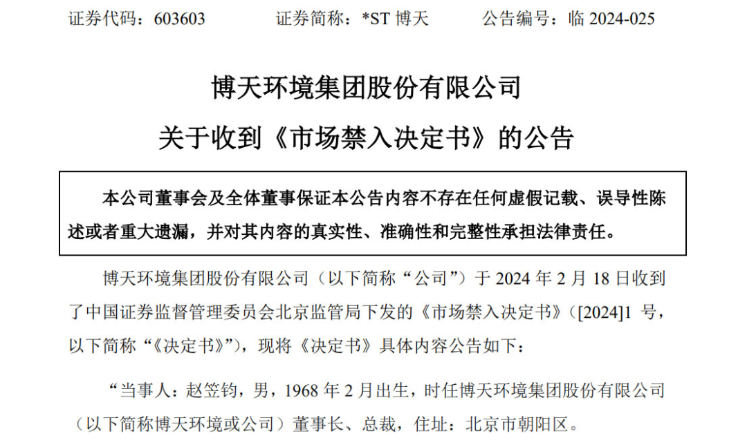博天環(huán)境受處罰一事又有新進(jìn)展。2月19日,博天環(huán)境公告稱,公司于2月18日收到北京證監(jiān)局下發(fā)的《市場禁入決定書》,認(rèn)定博天環(huán)境2017年、2018年、2019年、2020年、2021年年度報告存在虛假記載,構(gòu)成《證券法》所述的信息披露違法行為。