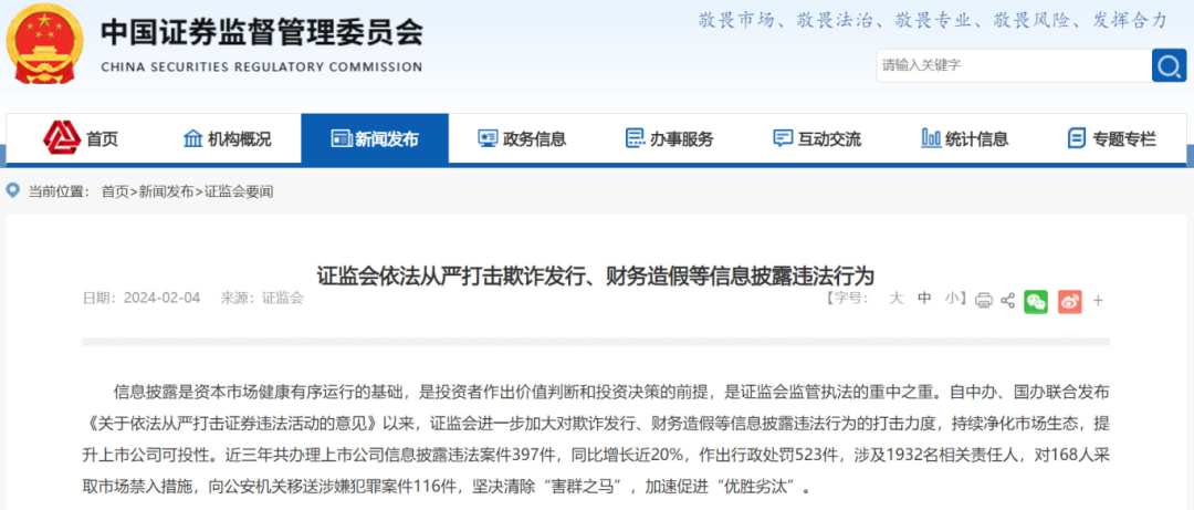 就在上個月,1月7日晚間,興源環(huán)境公告收到《行政處罰決定書》,因全資子公司存在虛增項目收入及成本等情況,導(dǎo)致公司財務(wù)數(shù)據(jù)存在虛假記載,興源環(huán)境及公司財務(wù)總監(jiān)分別被罰。《行政處罰決定書》顯示,興源環(huán)境的全資子公司——杭州中藝生態(tài)環(huán)境工程有限公司(下稱“中藝生態(tài)”)于2016年、2017年在長興縣美麗城鎮(zhèn)(標(biāo)段一、標(biāo)段二)PPP項目、溫州洞頭區(qū)本島海洋生態(tài)廊道整治修復(fù)工程PPP項目中存在虛增項目收入及成本等情況,導(dǎo)致興源環(huán)境2016年至2022年年報財務(wù)數(shù)據(jù)及相關(guān)披露存在虛假記載。浙江證監(jiān)局決定,對興源環(huán)境責(zé)令改正,給予警告,并處以200萬元罰款;對公司財務(wù)總監(jiān)孫穎給予警告,并處以80萬元罰款。事實上,興源環(huán)境接受處罰多少有點“冤枉”,因為此次導(dǎo)致處罰的中藝生態(tài)是興源環(huán)境收購而來的,2016年才納入合并報表,當(dāng)時雙方還簽署了業(yè)績承諾補償協(xié)議。這次虛增項目收入的事件爆發(fā)后,興源環(huán)境也表示,將高度重視業(yè)績承諾補償?shù)淖酚懝ぷ鳎瑪M安排專門隊伍并聘請專業(yè)機構(gòu)進(jìn)行研判,切實推動相關(guān)工作有效開展。還有此前曾被媒體曝出過“財務(wù)造假”的啟迪環(huán)境。2023年9月,湖北證監(jiān)局官網(wǎng)披露,因信息披露違法,對啟迪環(huán)境給予警告并處罰款60萬元,對時任董事長文一波等4位相關(guān)責(zé)任人給予警告并處罰款30萬元。調(diào)查顯示,啟迪環(huán)境在2017年-2018年間,通過偽造虛假分包合同及節(jié)點結(jié)算單確認(rèn)成本,虛構(gòu)了相關(guān)PPP項目(向社會資本開放的基礎(chǔ)設(shè)施建設(shè)和公共服務(wù)項目)合同完工百分比,提前確認(rèn)或虛假確認(rèn)總包合同收入,導(dǎo)致啟迪環(huán)境2017、2018年年報中主營業(yè)務(wù)收入、主營業(yè)務(wù)成本等項目存在虛假記載。2023年7月,龍凈環(huán)保收到中國證監(jiān)會福建監(jiān)管局的行政處罰決定書,認(rèn)定ST龍凈未按規(guī)定披露關(guān)聯(lián)交易,決定對公司給予警告,并處以一百萬元罰款。還有幾位相關(guān)責(zé)任人分別給予了警告和數(shù)額不等的罰款。再往前一個月,2023年6月,美尚生態(tài)也曾收到中國證監(jiān)會的行政處罰決定書,認(rèn)定美尚生態(tài)2015年公司招股說明書、2015年至2019年年報、2020年半年報、2016年非公開發(fā)行股份及支付現(xiàn)金購買資產(chǎn)并募集配套資金暨關(guān)聯(lián)交易報告書、2017年面向合格投資者公開發(fā)行公司債券募集說明書等信息披露文件存在虛假記載,決定對其責(zé)令改正,給予警告,并處以1330萬元罰款。更早以前,卓錦股份于2023年5月,*ST科林于2023年2月,也曾分別收到過證監(jiān)部門的處罰決定書,責(zé)令改正,給予警告,并處以一定數(shù)額的罰款。*ST科林的兩位相關(guān)當(dāng)事人杜簡丞、李根旺還被分別采取了3年證券市場禁入措施。證監(jiān)會嚴(yán)打財務(wù)造假