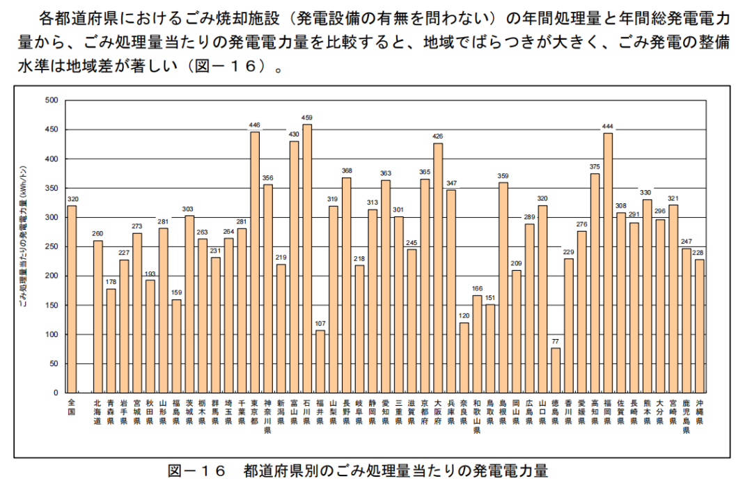 而2021年的日本二噁英污染清單顯示,火葬場(chǎng)的二噁英排放為3.6克TEQ,占比3.6%。同時(shí),根據(jù)日本環(huán)境省公開(kāi)的2021年垃圾焚燒量和二噁英排放量數(shù)據(jù),可以得出日本2021年垃圾焚燒的每噸二噁英排放因子,為1.235微克每噸。我國(guó)2020年,爐排爐二噁英排放因子為0.1206微克每噸,日本垃圾焚燒項(xiàng)目的平均垃圾二噁英排放因子,為我國(guó)爐排爐十倍,加權(quán)平均因子的8倍。(我國(guó)排放因子數(shù)據(jù),來(lái)自清華大學(xué)劉建國(guó)教授論文《National and provincial dioxin emissions from municipal solid waste incineration in China》) 垃圾焚燒廠中,大部分僅為余熱利用,少部分為余熱發(fā)電70.9%的垃圾焚燒設(shè)施(共729個(gè))實(shí)施了余熱利用。余熱利用的具體方式包括給溫泉、溫水游泳池和周邊居民供熱等。有396個(gè)垃圾焚燒設(shè)施配備了發(fā)電設(shè)備,占所有設(shè)施的38.5%。這些發(fā)電設(shè)施的裝機(jī)總量,為2149MW。總發(fā)電量為10452GWh,發(fā)電效率的平均值為14.22%。垃圾焚燒設(shè)施的平均發(fā)電量,約為320 kWh/噸。各都道府縣的垃圾焚燒發(fā)電廠,發(fā)電量出現(xiàn)明顯巨大差異。從趨勢(shì)上看,日本的垃圾焚燒,噸發(fā)電量水平,略弱于我國(guó)現(xiàn)有情況。