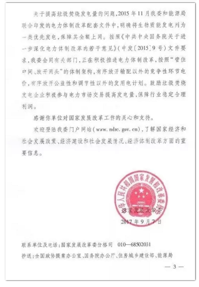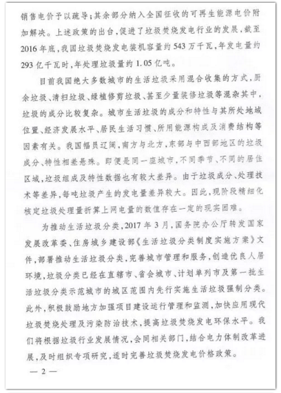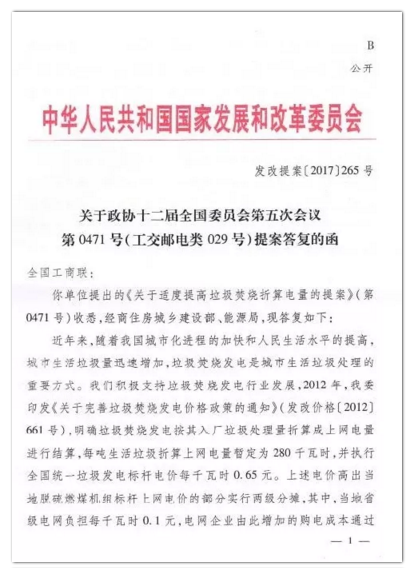 今年年初,環(huán)境商會以全國工商聯(lián)團(tuán)體提案的形式向兩會遞交《關(guān)于適度提高垃圾焚燒折算電量的提案》,國家發(fā)改委于9月正式答復(fù)。