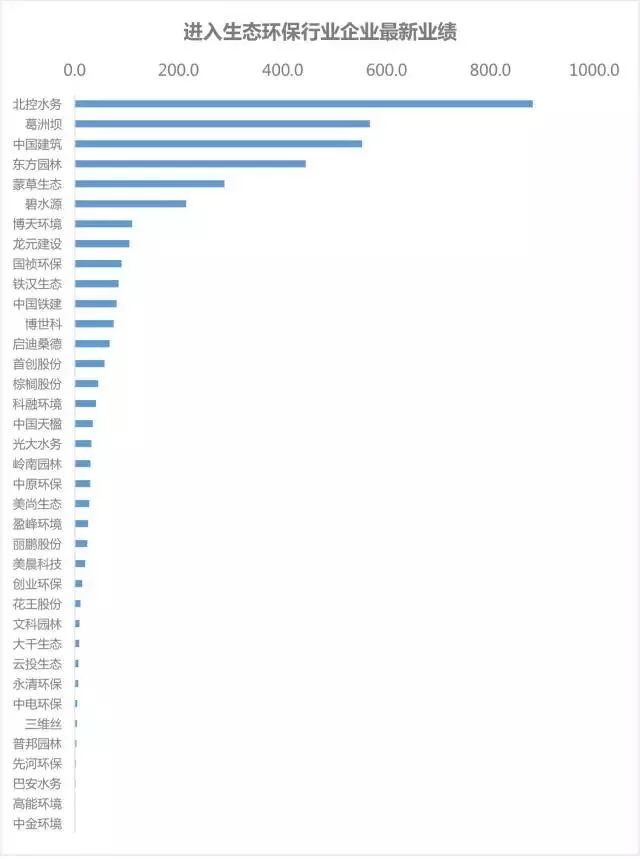 截至2017年10月31日, 36家企業(yè)在生態(tài)環(huán)保領(lǐng)域總中標金額達到4010.3億元,項目數(shù)量達268個。國企中生態(tài)環(huán)保領(lǐng)域業(yè)績最好的是北控水務(wù),總投資額達882億元,民企中業(yè)績最好的是東方園林,總投資額達444.5億元。