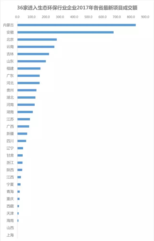 根據(jù)2017年36家上市生態(tài)環(huán)保類企業(yè)中標項目的投資金額數(shù)據(jù),從地區(qū)成交的項目類型來看,云南、湖南等地成交的項目較多為環(huán)保類,該地區(qū)的競爭也較為激烈,江蘇成交的項目較多的固廢處理,內(nèi)蒙古成交的項目多為環(huán)境修復(fù)類,大氣污染治理類成交的項目多在山東、河北等地區(qū)。