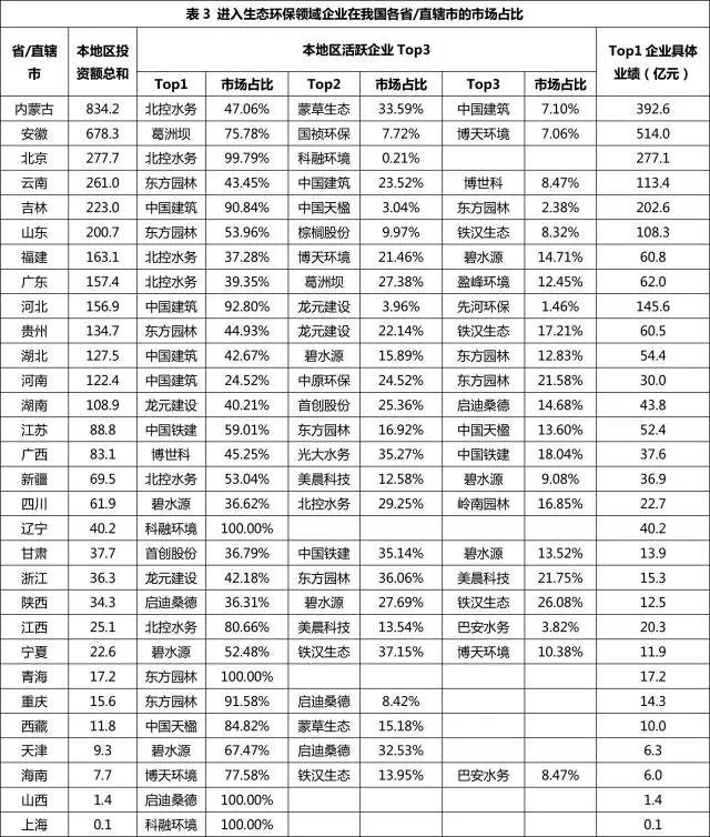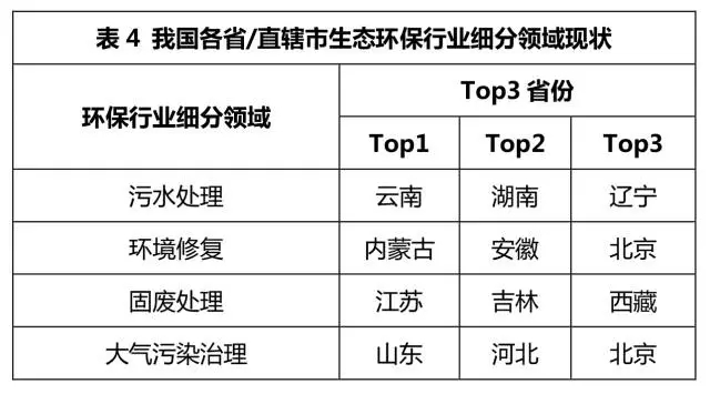 在各省/直轄市生態(tài)環(huán)保行業(yè)細分領(lǐng)域Top3的省份詳情見表4。