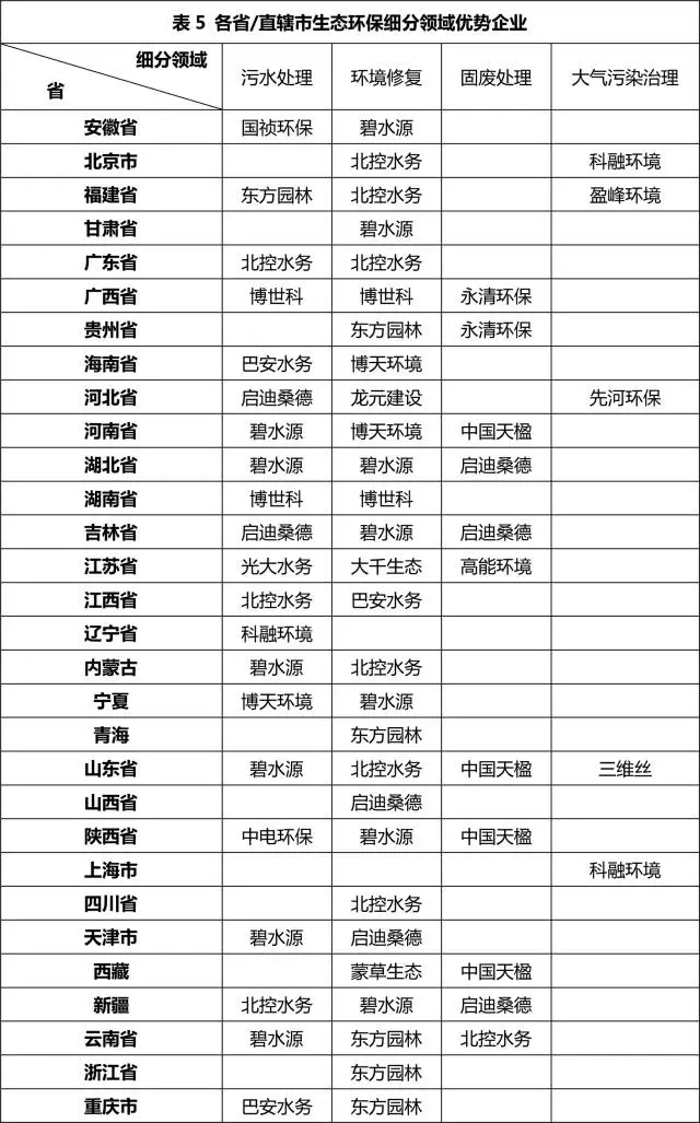 全國各省/直轄市生態(tài)環(huán)保細分領(lǐng)域板塊的優(yōu)勢企業(yè)詳情見表5。