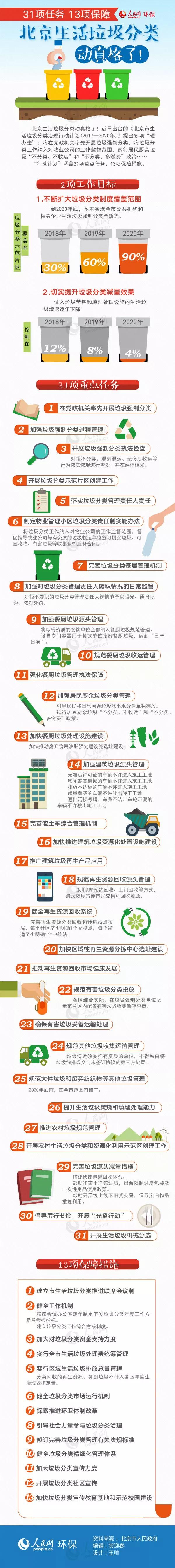 北京市人民政府辦公廳于2017年11月發(fā)布了《北京市生活垃圾分類治理行動計劃》(2017—2020年),其中的31項任務(wù)、13項保障,圖解如下: