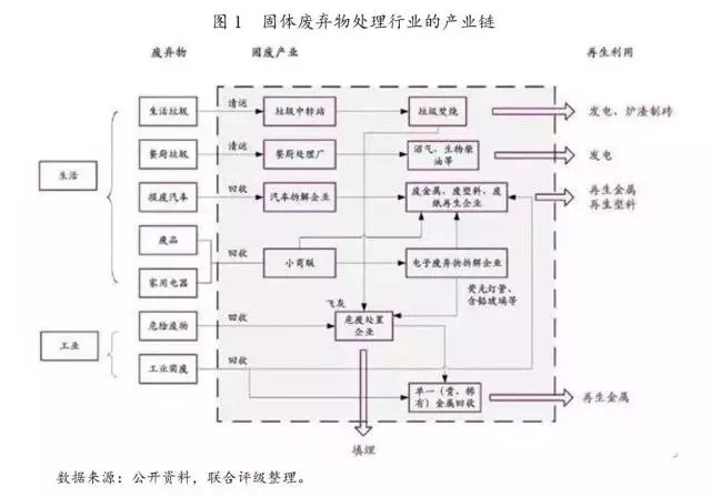 固體廢棄物主要來(lái)自于居民生活和工業(yè)生產(chǎn),數(shù)量巨大,品種繁多,要求相應(yīng)的處理手段嚴(yán)格,可重復(fù)利用程度較高。固體廢棄物通過(guò)填埋、焚燒、堆肥、回收利用或者循環(huán)再生方式進(jìn)行無(wú)害化處理。固體廢棄物處理行業(yè)的產(chǎn)業(yè)鏈如下圖所示。