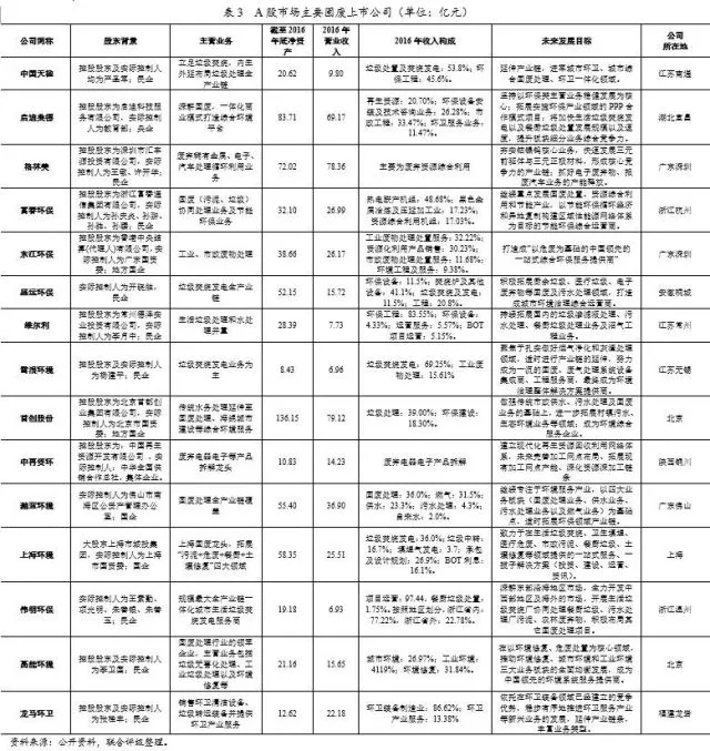 聯(lián)合評(píng)級(jí)對(duì)A股市場(chǎng)從事固廢處理行業(yè)的上市公司進(jìn)行了整理,具體公司情況如下表所示: