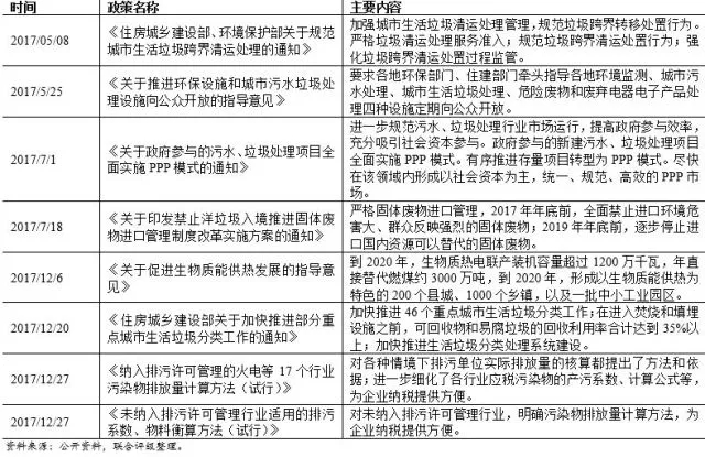 《“十三五”全國(guó)城鎮(zhèn)生活垃圾無(wú)害化處理設(shè)施建設(shè)規(guī)劃》助推垃圾焚燒發(fā)電行業(yè)快速發(fā)展;最新頒布的《國(guó)家危險(xiǎn)廢物名錄》對(duì)于危廢的識(shí)別更加清晰,危廢處理更加有據(jù)可循;《環(huán)境保護(hù)稅法》于2018年1日1日正式施行,“排污費(fèi)改稅”有利于引導(dǎo)排污單位減少污染物排放;《納入排污許可管理的火電等17個(gè)行業(yè)污染物排放量計(jì)算方法(試行)》和《未納入排污許可管理行業(yè)適用的排污系數(shù)、物料衡算方法(試行)》是全面細(xì)化和保障環(huán)保稅法實(shí)施的綜合性配套法規(guī),進(jìn)一步明確環(huán)保稅稅制要素。