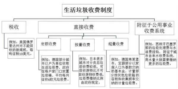 國(guó)際上,生活垃圾收費(fèi)制度主要包括三種類型:稅收方式、直接收費(fèi)方式和附征于公用事業(yè)收費(fèi)系統(tǒng)方式。