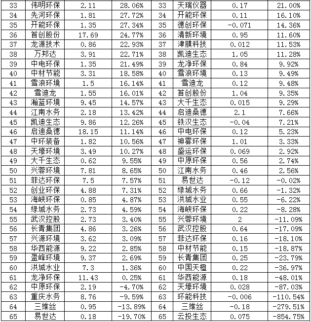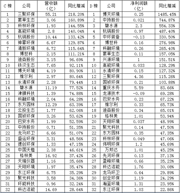 中環(huán)裝備凈利潤虧損0.13億元,居然還能位于D榜的第五,扭虧為盈的能力讓人佩服。不過凈利潤增長主要是子公司中節(jié)能六合天融環(huán)??萍加邢薰经h(huán)境監(jiān)測與大數(shù)據(jù)、大氣治理業(yè)務(wù)收入同比增長。而虧損的原因則是傳統(tǒng)脫硫脫硝業(yè)務(wù),相對毛利率較低,并且裝備制造業(yè)務(wù)板塊整體利潤同比降低。